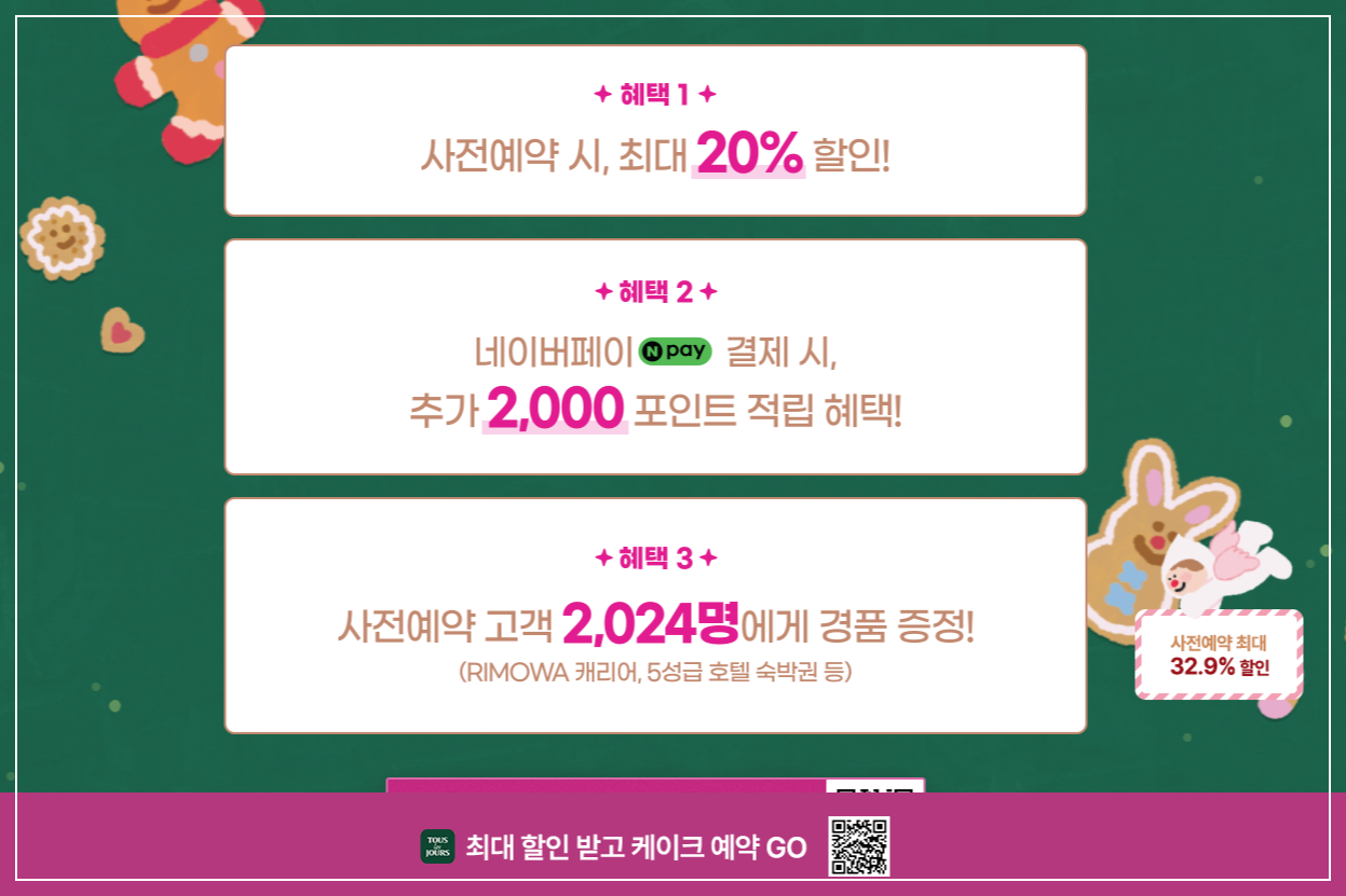 더불어, 사전예약 고객 중 2,024명에게는 경품으로 RIMOWA 캐리어와 같은 다양한 상품이 증정되는 이벤트도 진행됩니다. 이러한 혜택을 통해 더욱 알뜰하게 크리스마스 케이크를 구매할 수 있습니다.
